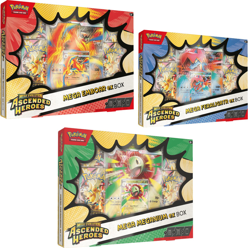 Pokémon TCG: Mega Evolution – Ascended Heroes ex Box: Mega je prémiové balenie z edície Mega Evolution – Ascended Heroes, ktoré spája zberateľskú hodnotu s hernou silou. Každý box je venovaný jednému z troch ikonických Mega Evolution Pokémonov ex – Mega Meganium, Mega Emboar alebo Mega Feraligatr – a obsahuje exkluzívne promo karty spolu so štvoricou booster balíčkov.