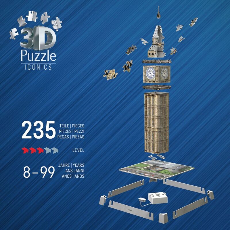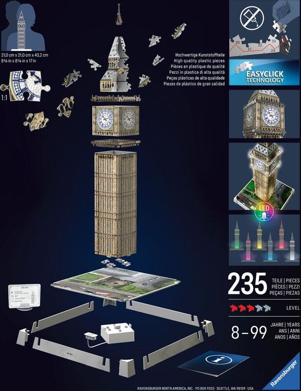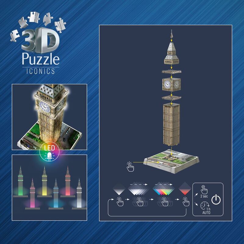 3D model Big Ben "Night Edition" je radosť skladať. Môžete skladať podľa predlohy alebo čísel, ktoré sú súčasťou každého z 216 platových dielikov. Výsledkom je úžasný model, ktorý zložíte bez potreby lepenia! Svietia, menia farby.