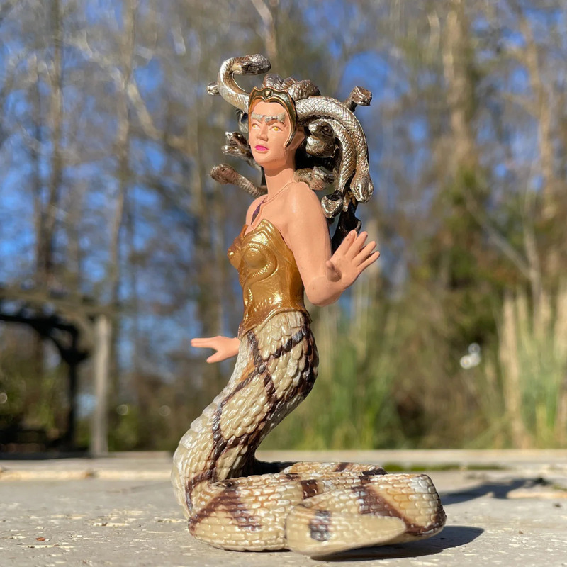 Mýtická postava so zmiešanými črtami človeka a hadov namiesto vlasov. Je známa svojou schopnosťou paralyzovať pohľadom alebo svojou smrteľnou mocou.