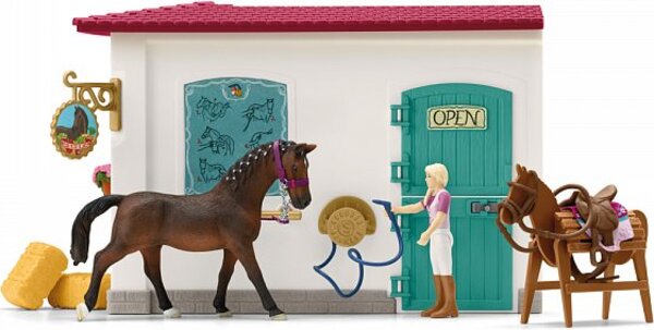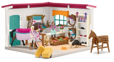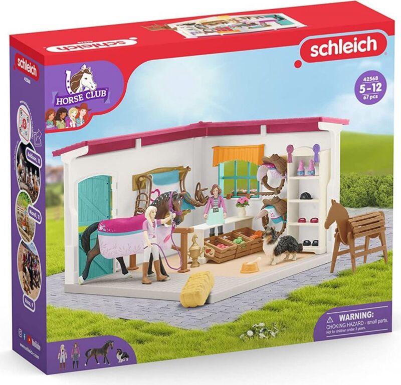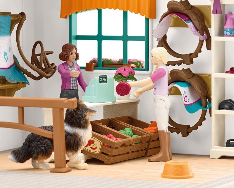 Cink! Zákazníci sú tu! Príď do jazdeckého obchodu z kolekcie Schleich® HORSE CLUB, kde si môžeš celé hodiny prezerať tovar a potom s úsmevom odísť. Buď preto, že si našiel niečo naozaj skvelé pre svojho koňa, alebo preto, že ti pani za pultom zložila kompliment. Ona je totiž vždy nadšená zo všetkých koní, čo máš v zbierke. Vo svojom obchode predáva iba to najlepšie. Krmivo, sedlá, kefy, dokonca aj psa – a áno, možno aj tú sponku, čo sa ti stratila minul týždeň. Určite ti čoskoro dá zľavu pre stálych zákazníkov a ako vždy má pre teba vľúdne slovo.