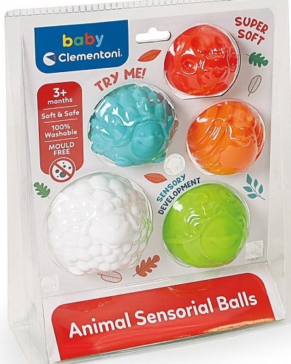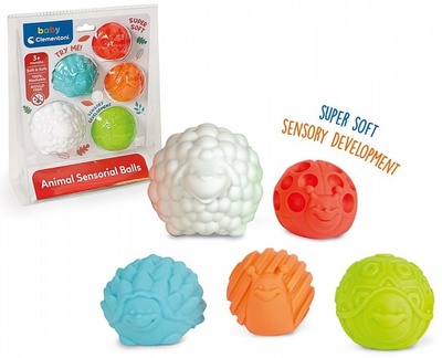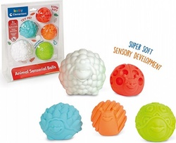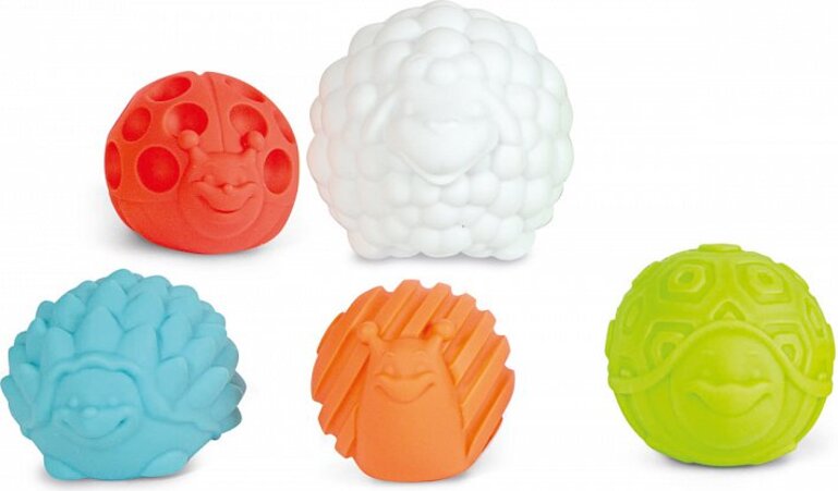 Súprava piatich mäkkých loptičiek v tvare zvieratiek. Rôzne textúry stimulujú zmyslový vývoj dieťaťa, pozitívne ovplyvňujú zlepšenie obratnosti a koordinácie batoľaťa.