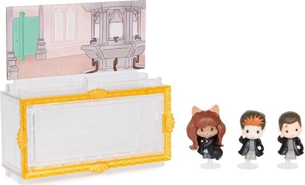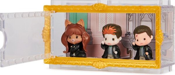 Prežite nezabudnuteľné filmové momenty so sadou figúrok z kúzelníckeho sveta Harryho Pottera a Tajomnej komnaty z radu Micro Magical Moments.Toto multibalenie obsahuje figúrky Harryho Pottera, Hermiony Grangerovej a Rona Weasleyho o veľkosti 3,81 cm a priehľadnú krabičku s obojstranným pozadím a tri stojany na figúrky. Rozbaľte svoje postavy a objavte ich rozkošné detaily: Harry a Ron sa premenili na Vincenta Crabbea a Gregoryho Goyla a Hermiona na mačku! Pozadie krabičky zobrazuje záchody, kde trojica lektvar vypila, detail, ktorý si fanúšikovia a zberatelia Harryho Pottera zamilujú. Postavy si môžete vystaviť na stojane, v krabičke alebo ich postaviť samostatne.