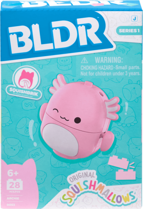 Táto BLDR sada obsahuje 28 dielikov na stavbu obľúbenej postavičky Squishmallows – axolotla Archieho.