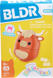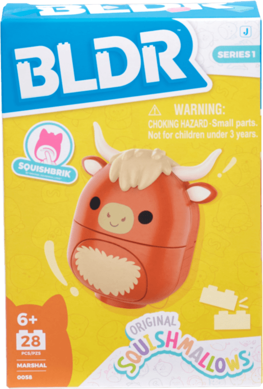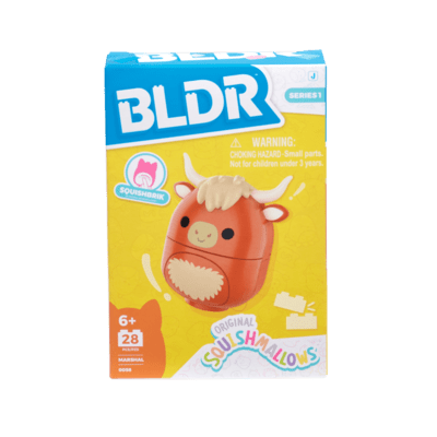 Táto BLDR sada obsahuje 28 dielikov na stavbu obľúbenej postavičky Squishmallows – býka Marshala.