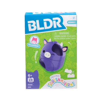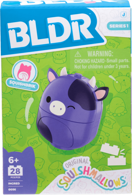 Táto BLDR sada obsahuje 28 dielikov na stavbu obľúbenej postavičky Squishmallows – kravy Ingred.
