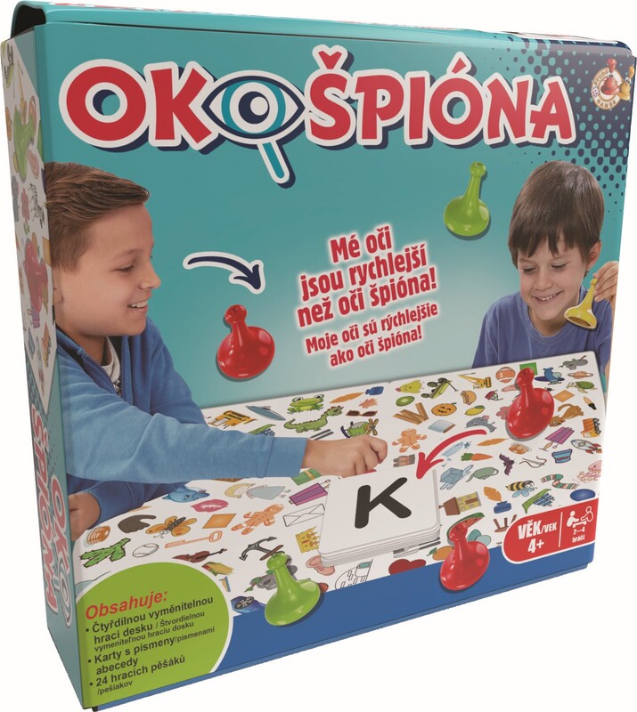 STUDO GAMES - Oko špióna je fascinujúca, dynamická a vzrušujúca hra, ktorá nielenže zlepšuje rýchlosť a ostrosť detského zraku, ale taktiež rozvíja ich logické myslenie a znalosť abecedy. S týmto produktom sa každé dieťa stane malým špiónom, ktorý musí nájsť obrázok na hracej ploche zodpovedajúci aktuálne otočenému písmenu. Štvordielna vymeniteľná hracia doska zaisťuje, že žiadne dve hry nebudú rovnaké a budú tak stále zábavné.