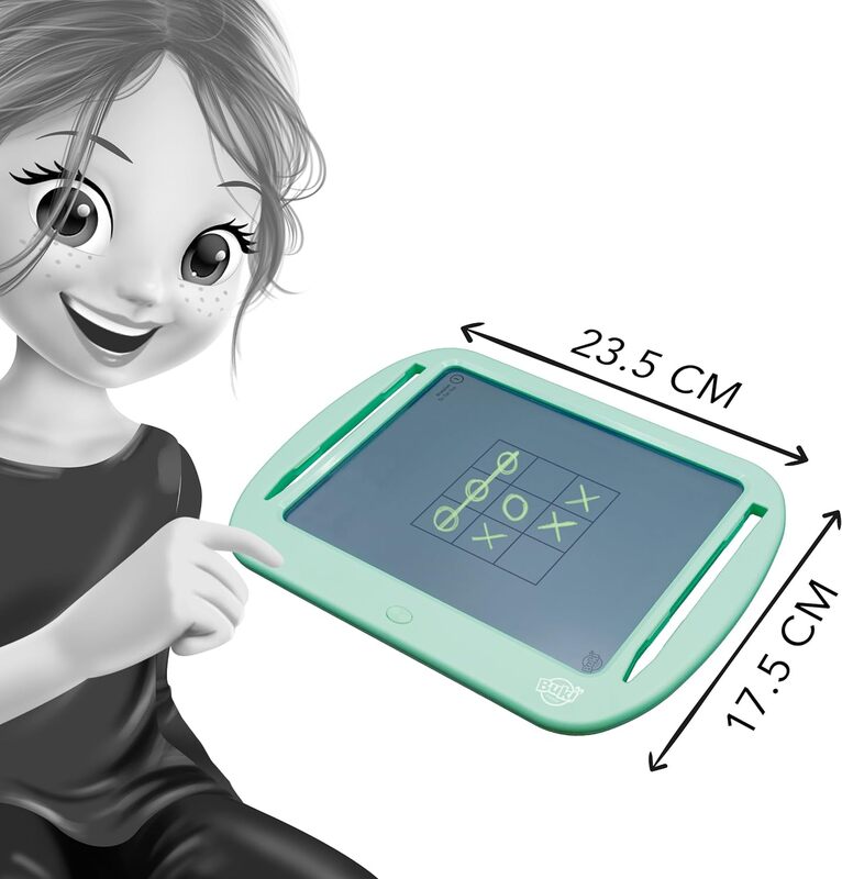 Predstavujeme vám tablet BUKI, ideálny pre hranie 20 rôznych klasických mini hier. Tento ľahký a prenosný tablet s hmotnosťou len 150 g môžete vziať kamkoľvek so sebou a zabaviť sa vždy, keď máte čas.Použite jednu z herných kariet a vložte ju pod tablet, aby ste mohli hrať s priateľom hry ako piškvorky, námornú bitku, sudoku a mnoho ďalších. Pomocou dvoch dodaných stylusov môžete na obrazovke zaškrtávať, písať alebo kresliť. Ak chcete začať novú hru, jednoducho stlačte tlačidlo na vymazanie plochy.