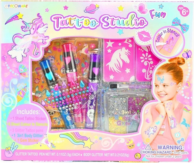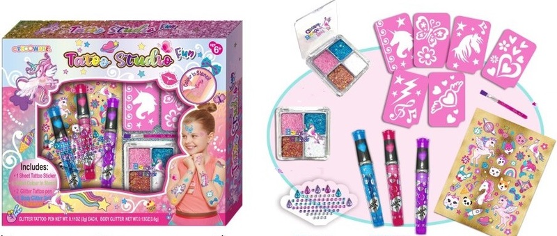 Sada obsahuje tetovanie, ozdobu do vlasov, trblietky na telo, kamienky, šablóny, farebné tetovacie perá. Zaži veľa zábavy a ozdôb seba i kamarátov.