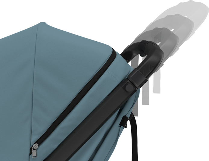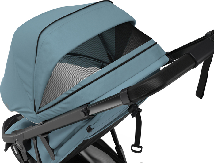 Veľká rozkladacia strieška z ripstopovej tkaniny a s integrovaným rozšírením, ktoré chráni pred nízkym slnkom a poskytuje ochranu pred UV žiarením s UPF 50+.