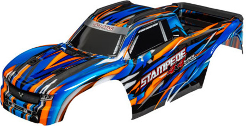 Náhradný diel pre RC modely áut Traxxas Stampede 4x4 1:10 VXL: karoséria oranžová. Nafarbená, aplikované obtlačky, zostavená s predným a zadným držiakom nadstavby a zadnou podperou nadstavby pre montáž bez klipov. Rázvor 295mm.