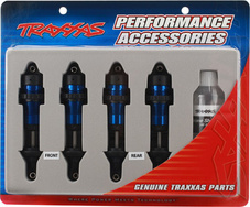 Traxxas tlmič GTR hliníkový modrý (2ks predenie, 2ks zadný) so silikónovým olejom. Konštrukcia GTR má hliníkové telo so závitom a krúžkom na presné nastavenie predpätia. Chrómované hriadele majú vysokú životnosť a hladký chod. Vnútri tlmiče sú tlmiace gumené telesá kompenzujúce objem, aby sa zabezpečilo dokonalé tlmenie v celom rozsahu. Tlmiče GTR sú odporúčané pre vnútro auta Traxxas, pre XO-1, E-Revo® VXL.