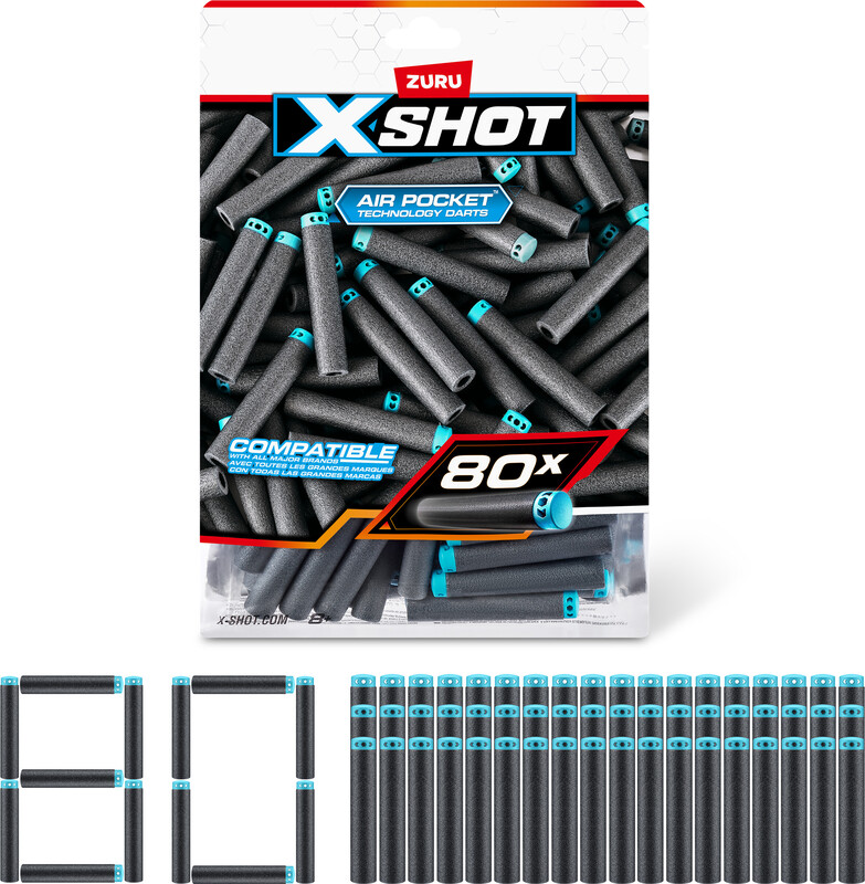 Nenechajte si ujsť žiadnu príležitosť a buďte vždy pripravení s týmto praktickým doplňovacím balením, ktoré obsahuje 80 penových šípok! Šípky X-Shot s technológiou Air Pocket (Vzduchové vrecko) sú navrhnuté tak, aby lietali ďalej, rýchlejšie a presnejšie. Sú vyrobené z úžasnej ľahkej peny a ponúkajú najlepší výkon.