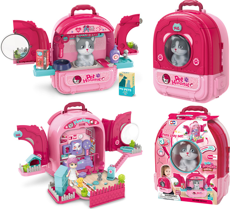 Tento set obsahuje až 64 dielikov, ktoré zahŕňajú všetko potrebné pre starostlivosť o zvieratká a veterinárnu prax: domček pre domáce zvieratá, podnos na kŕmenie, bazén, veža pre mačky, nožnice, hrebeň, krmivo pre mačky a psov, lekársku súpravu, vyšetrovacie lôžko, stetoskop, závesnú fľašu, rastliny v črepníkoch, nálepky, plot a ďalšie doplnky. Súčasťou je aj praktický batoh, ktorý umožňuje ľahkú a pohodlnú prepravu všetkých komponentov.
